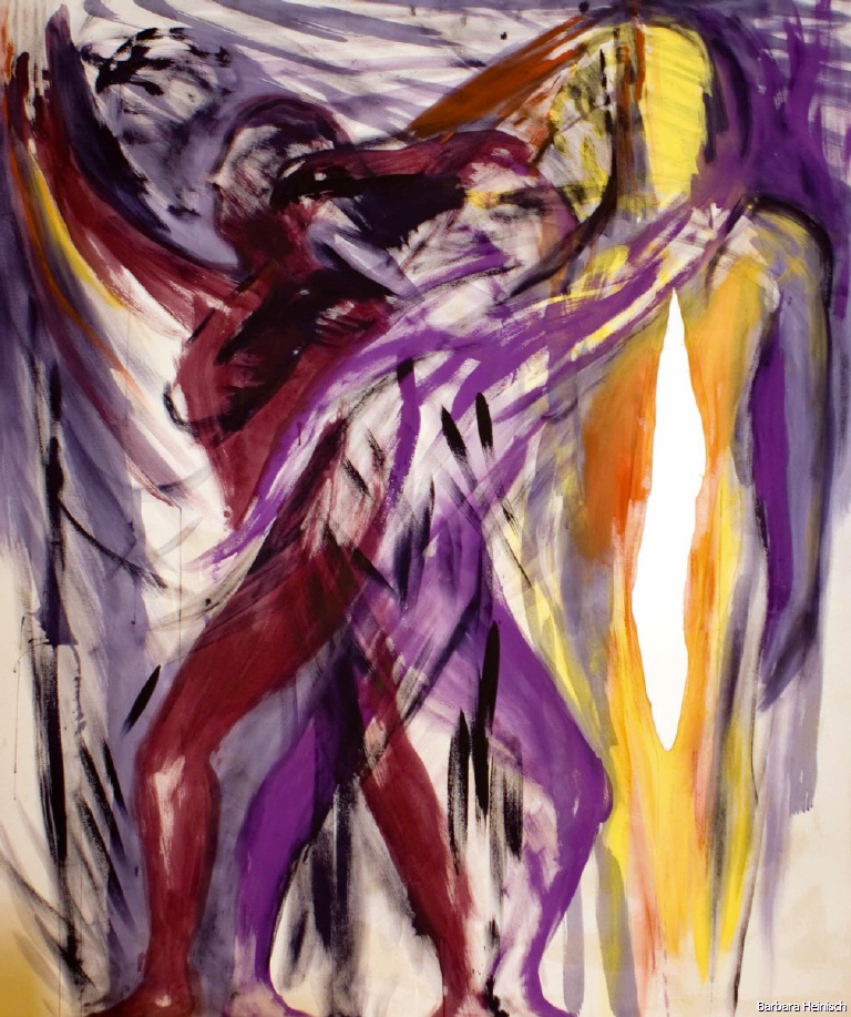 Am Ende der Vorführung befreit die Künstlerin das Modell, indem sie ihm mit einem Messer einen Weg durch das Werk bahnt. Das Modell wird aus der Anonymität von der Künstlerin herausgehoben und ist als Akteur im Prozess der Entstehung sichtbar. Barbara Heinisch steht für eine ganz eigene Form der Prozessmalerei, die in der Zusammenarbeit mit dem Modell, der Musik immer wieder aufs Neue entsteht. Barbara Heinisch wird u.a. von der Galerie Meta Weber in Krefeld vertreten.