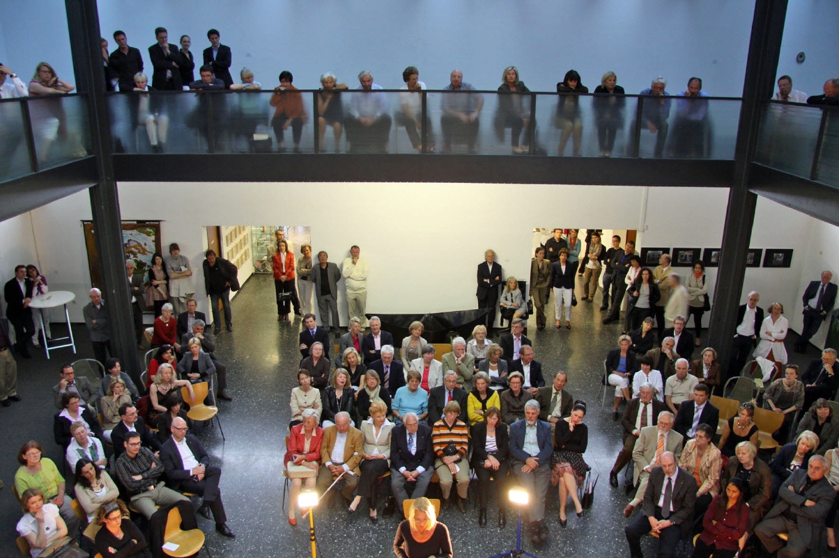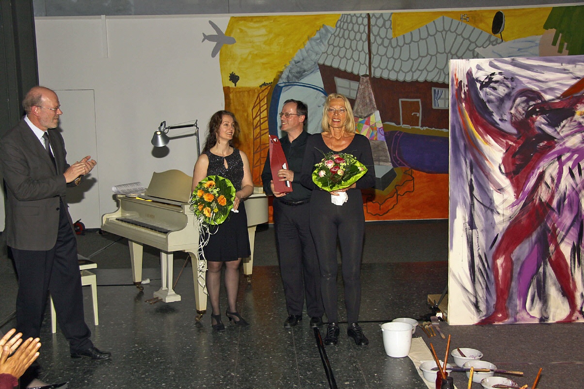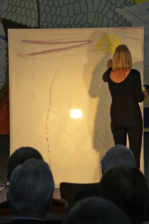 Mannheim, Kunstverein, Barbara Heinisch - Eine großformatige Leinwand beherrscht den Raum des Kunstvereins Mannheim. Die Sängerin Käthe Wilhelmi inszeniert dahinter für das Publikum versteckt die Kantate "Arianna a Naxos", begleitet von dem Pianisten Hermann Wilhelmi. Die Künstlerin Barbara Heinisch hält ihre Eindrücke dabei auf der Leinwand fest, inspiriert von den unmittelbaren Einflüssen des Geschehens. Kunst als interaktives Ereignis, "Trialogmalerei" (oder auch Prozessmalerei) nennt Heinisch ihre Arbeitsweise, die sie kürzlich in der Augustaanlage vorgestellt hat.