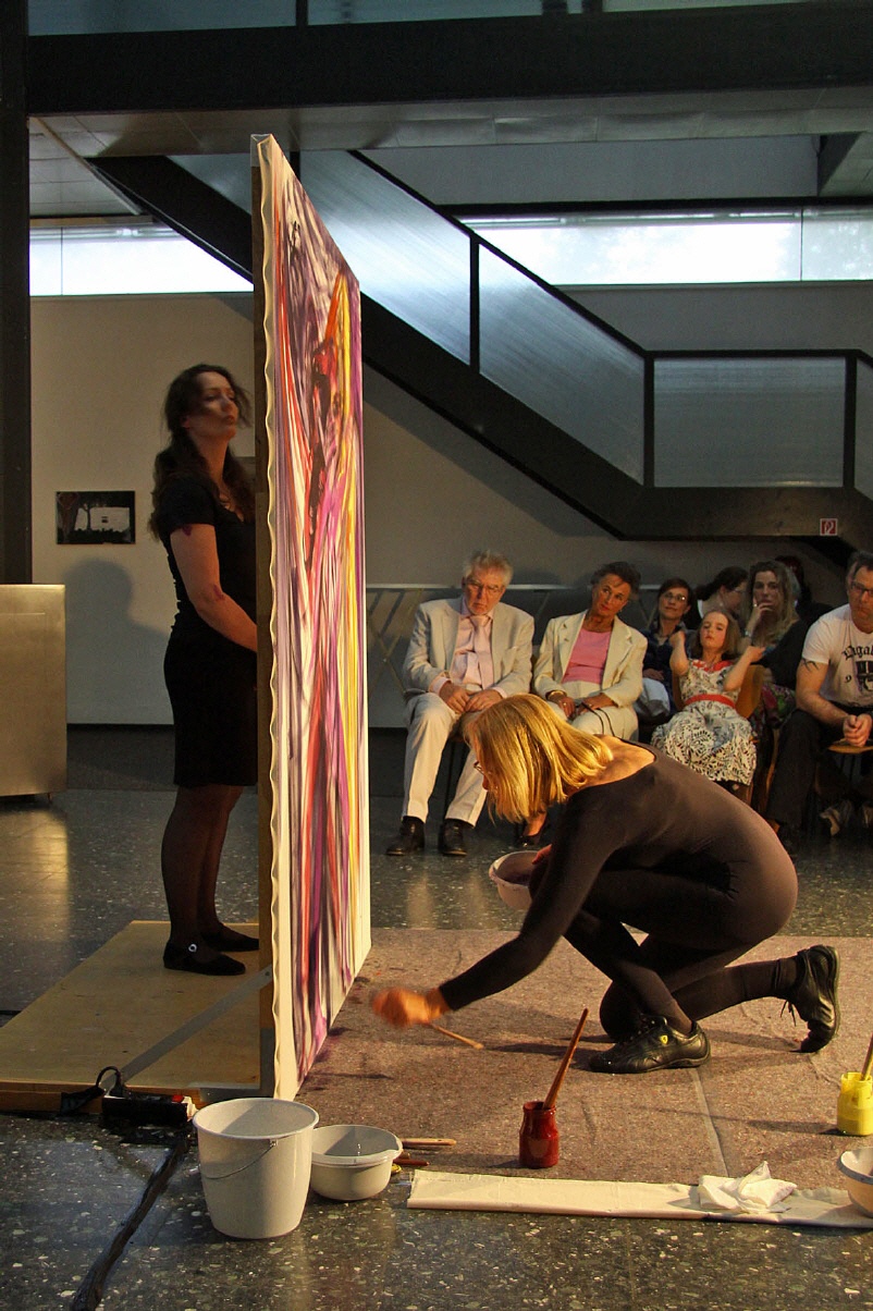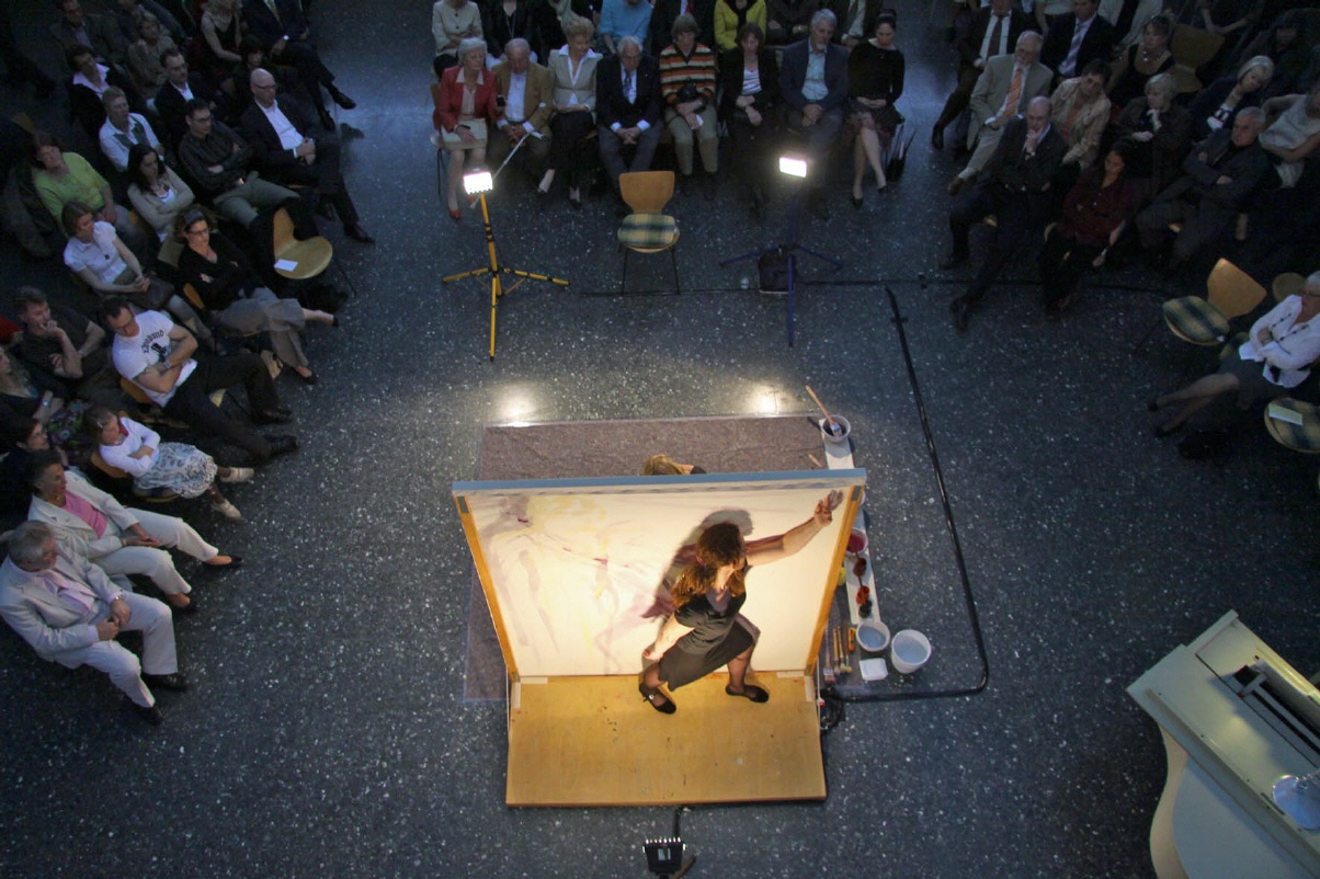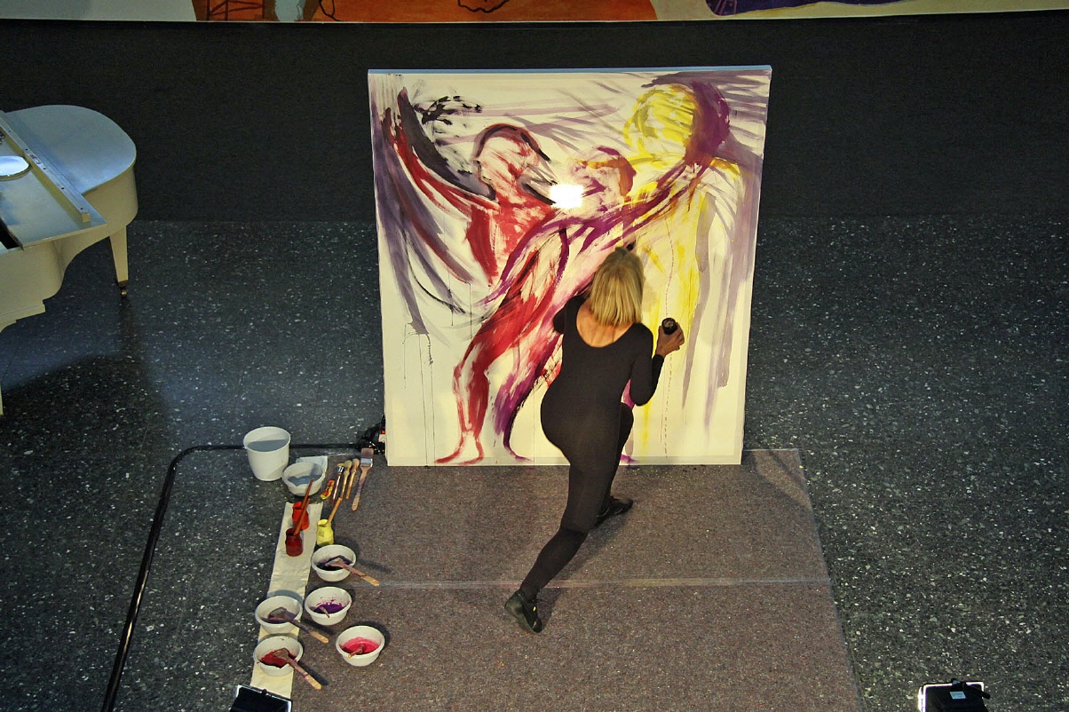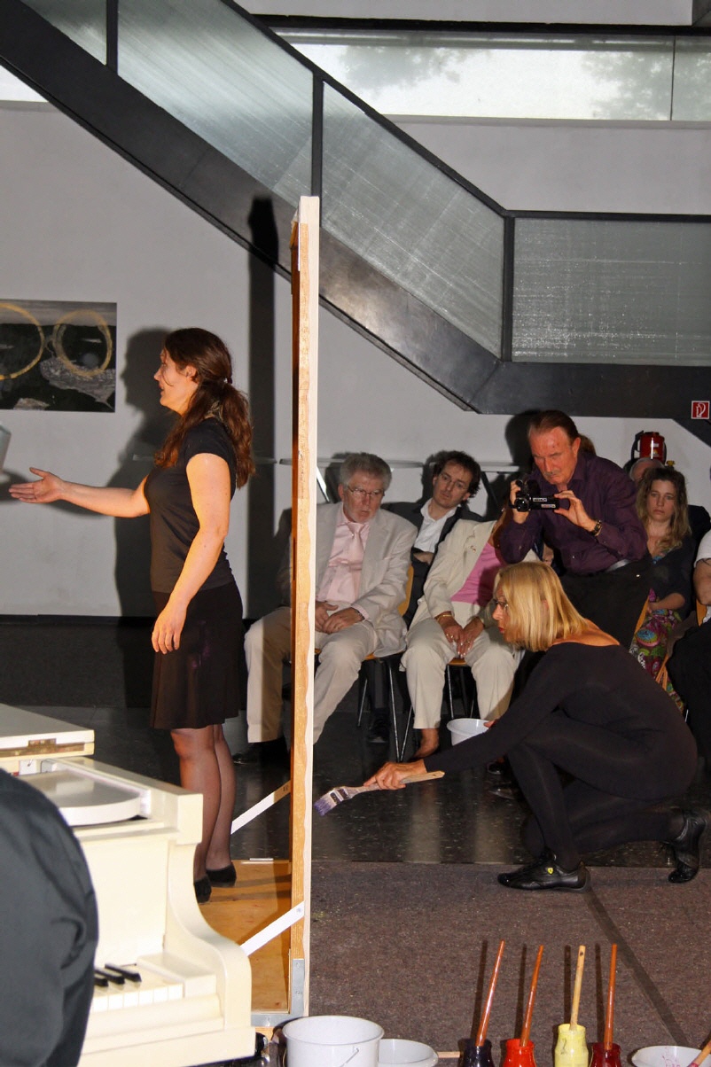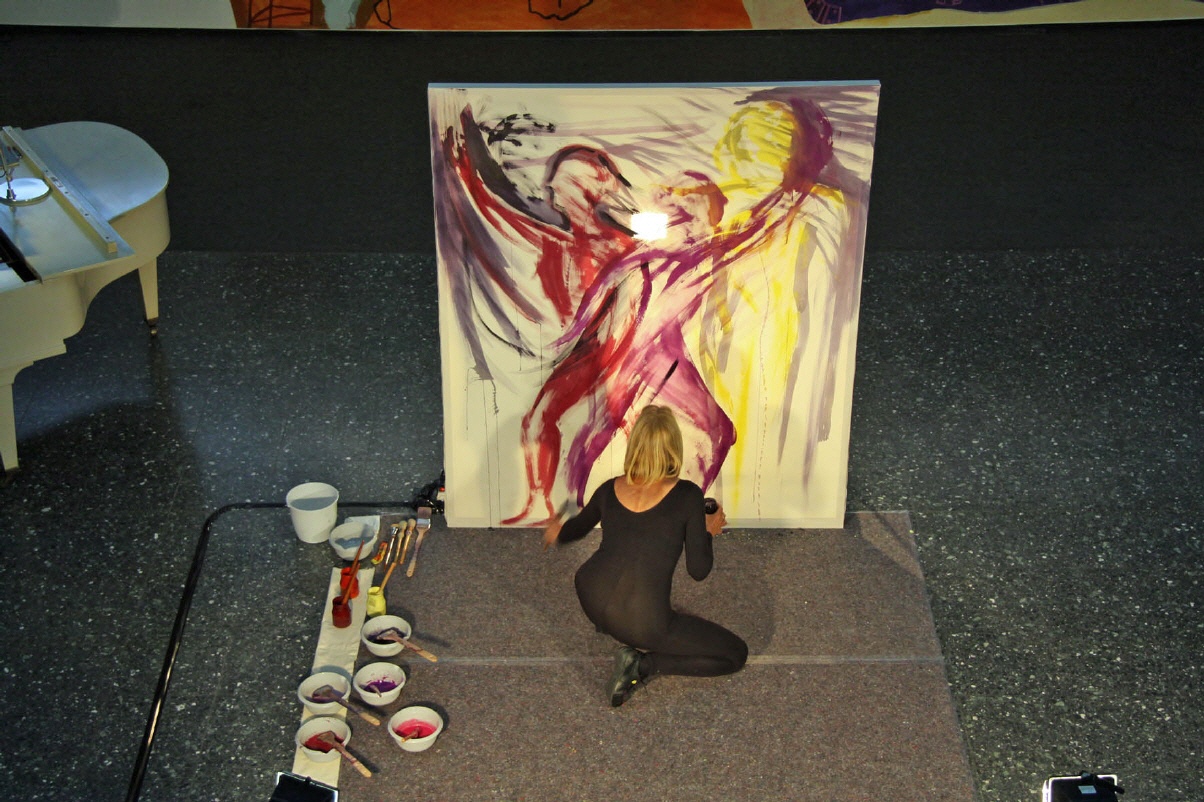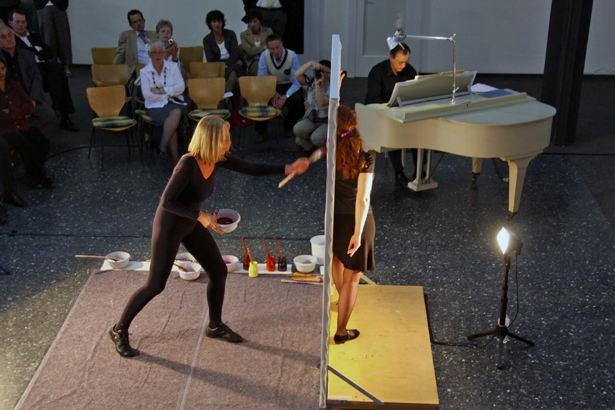 Malerei als Ereignis von und mit Barbara Heinisch (Konzept und Malerei), Käthe Wilhelmi (Gesang) und Hermann Wilhelmi (Piano) im Kunstverein Mannheim; Video Kurt Ernst Köhler.