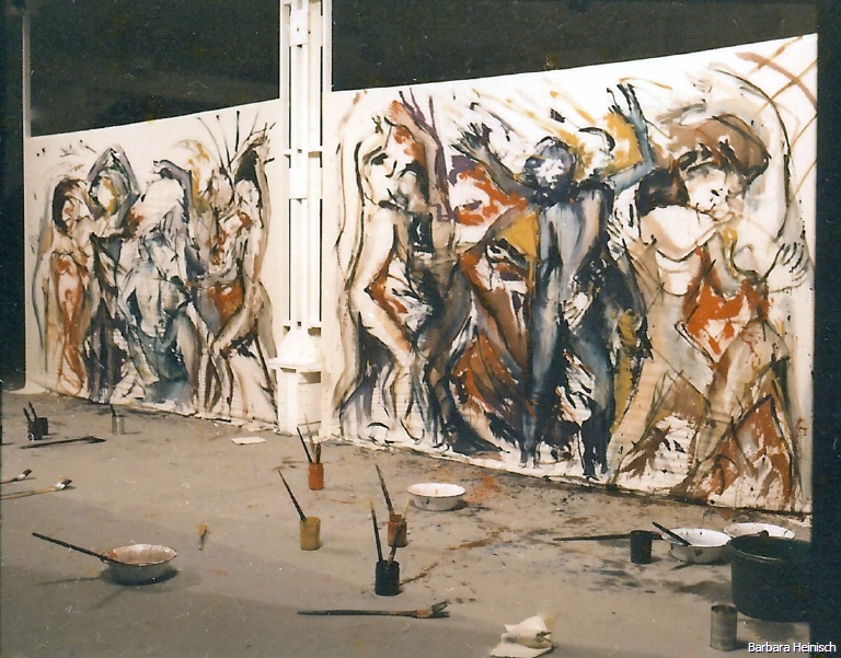 Eine Vielzahl von Menschen scharen sich am 14.05.1983 in einem Raum der Galerie Dibbert in Berlin zusammen. Der Anlass hierzu ist eine Performance von Barbara Heinisch. Die Zuschauer und Zuschauerinnen nehmen größtenteils auf dem Boden Platz, während sich später Dazugekommene stehend, Schulter an Schulter, aneinanderreihen. Bis sie sich schließlich zu der Dachschrägen des Raumes, in der ein Fenster einen Spalt breit geöffnet ist, drängen. Eine Person sticht inmitten dieser Menschenmenge besonders hervor: Eine Frau mit schulterlangem braunem Haar und einer Brille, gekleidet in einem schwarzen Overall, die sich an einem säulenartigen Gebilde aus Rohren ablehnt. Es ist Barbara Heinisch. Allen gemein ist der nach vorn fokussierte Blick. Im Hintergrund schallen im Takt zwei immer wiederkehrende Trommelschläge, wiedergegeben von Steve Reich. Ähnlich einer Herzfrequenz, nur deutlich langsamer, pulsieren die Töne durch den Raum. Nach einigen Sekunden begibt sich Heinisch ruckartig in die Raummitte. Dort liegen Pinsel, Farbtöpfe und weiße Schalen zurechtgelegt. Sie greift nach einem der Pinsel, tunkt ihn in Farbe und schnellt zu den Leinwänden – zwei 200 x 300 cm große Nesseltücher, die zwischen drei im Raum stehenden Stützen aufgespannt sind. Wie ein Tor wirkt das Konstrukt...