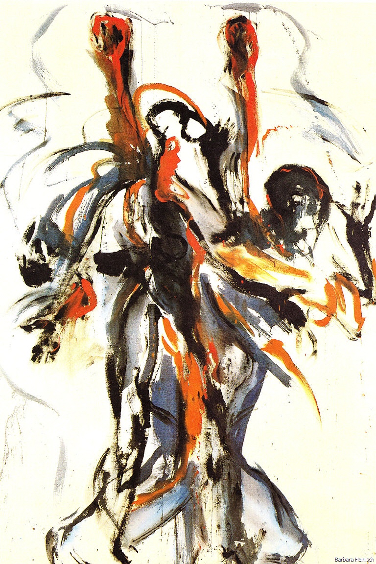 Bei Barbara Heinisch fängt auch die Wirklichkeit - das abzubildende Gegenüber - zu tanzen an und auch sie nimmt im Malakt die Bewegung des anderen nicht nur in der Malerei, sondern gleichsam in den eigenen Körper auf, antwortet, reagiert, intensiviert. Der Tanz zieht sich als "formale Überlegung" durch das Werk von Barbara Heinisch etwa seit 1979 bis heute hindurch, wobei das Formale, das nämlich das Gegenüber nicht mehr nur in der Pose festgenagelt dem Maler ausgeliefert ist, sondern sich in seiner Bewegung und Körperlichkeit als Mensch entfaltet und lebt, sogleich auch inhaltlich und über das Bild hinaus zu wenden ist: Im Tanz steigert sich der Tanzende über seine engen Körpergrenzen, kommuniziert, rauschhaft fast mit dem Raum, der ihn umgibt. Dieses Moment der Transzendenz, der Überschreitung und Steigerung ist auch ein Ziel und ein Inhalt ihrer Malerei, das noch als Spur (rückwärts gerichtet) und als Utopie (nach vorn) dem Leinwandbild anhaftet. Erinnerungsspur der Aktion, in der sie den anderen und sich selbst erfährt und schafft...