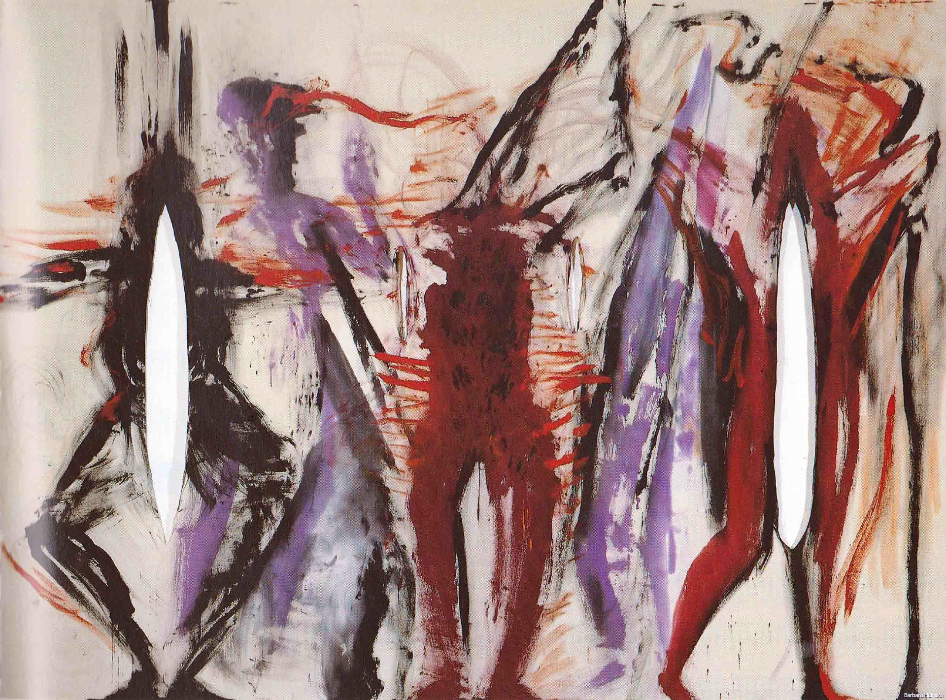 Im Bild WandlungsZeichen entstanden auf einem Therapie-Kongreß in München 1993, verdichtet sich die Gestik der permanenten Umkehr konsequent in Metaphern zwischen Tod und Leben: zwischen der wie von oben herabfahrenden Todesfigur in Grätschenstellung (links) und der weiterschreitenden Lebenshoffnung (rechts), beide durch den Riß der Wandlung markiert. Ihre Wandlung ermöglicht den ständig neuen Versuch der Individuation in der Mitte, der sich spannungsreich (violett) gestische Figuren schöpferisch nähern und von ihr lösen. Gesundung, in roten situativ unterschiedlich gelagerten Kraftströmen angedeutet, gelangt im Zentrum immer nur zu einer vorübergehenden Ruhe...